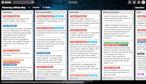 Lately, I’ve seen some major benefits in creating my affinity maps in a digital format. I used Trello for this. I'm more rapid in this format at taking notes and experimenting with different ways of labeling and categorizing the information. This keeps experimentation fun and low-risk.