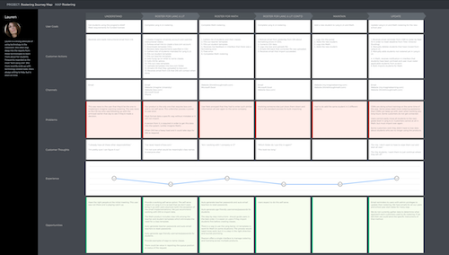 My approach is heavily influenced by the Neilson Norman Group customer journey mapping course. I choose a single persona and story to represent in a journey map with the intent to build empathy and reveal opportunities to improve the customer experience.